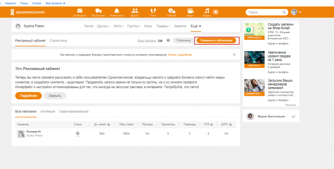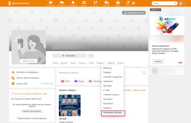 Способ 1: через рекламный кабинет в «Одноклассниках»