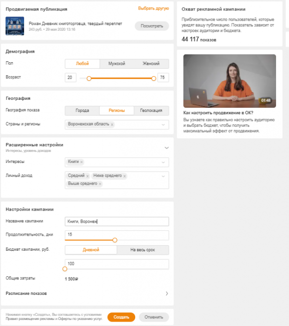 Далее выполняем стандартные настройки рекламной кампании: таргетинг, география, расписание показов, модель оплаты, бюджет и т. д. Подробно о том, как настраивать рекламу в «Одноклассниках» через myTarget, можно почитать в нашем материале.