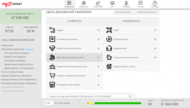 Создайте рекламный кабинет в myTarget, если у вас еще его нет, затем нажмите «Создать кампанию». Выберите цель «Действия в социальных сетях» и добавьте ссылку на карточку товара, который хотите продвинуть, или на группу магазина.