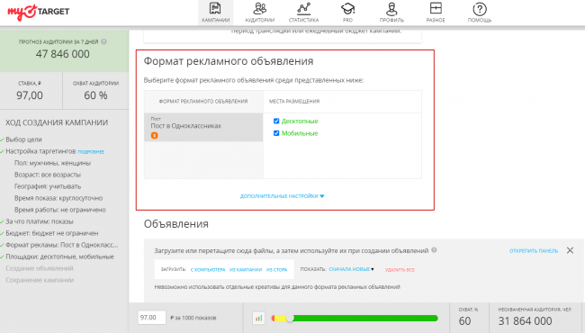 Реклама будет показываться в формате «Пост в „Одноклассниках“», это кроссдевайсный формат, т. е. отображается на дестопах и мобильных. Вы можете отключить какой-то тип устройств, оставив только мобильные или только десктоп.