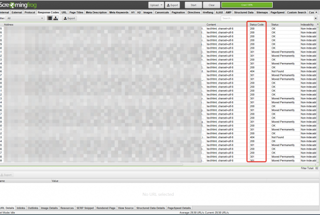 В исправлении ошибок могут помочь сервисы автоматизации: Marylin, K50, Alytics и другие. Или в нашем случае «Лягушка» (Screaming Frog SEO Spider) для автоматической проверки большого количества страниц сайта на предмет наличия ошибки 404 или редиректов, как на скриншоте ниже.