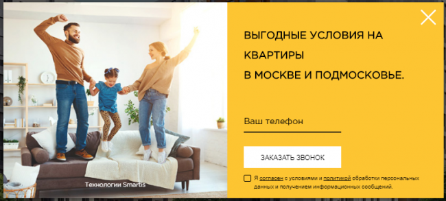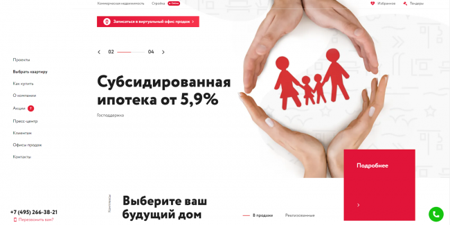 Пример call-to-action на сайте застройщика. Призывы к действию: фраза «Выберите ваш будущий дом», номер телефона с предложением перезвонить, блок «Подробнее» и виджет обратного звонка
