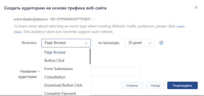 Через 30 дней активного ведения рекламы в TikTok вам может стать доступно автообновление аудиторий ремаркетинга. Вы увидите уведомление об этом в рекламном кабинете. Однако все ранее созданные аудитории автоматически не обновятся, их все равно нужно будет пересоздать. В дальнейшем они всегда будут актуальны.