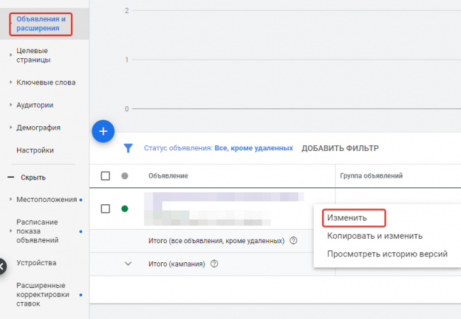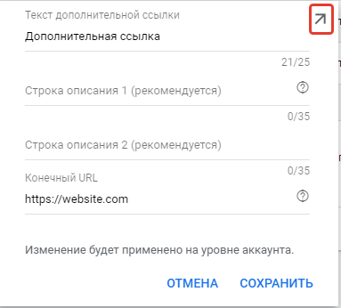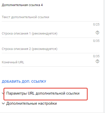 Уровень объявления: Объявления и расширения — Изменить — Параметры URL объявления.