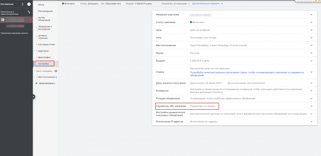 Уровень кампании: Выбранная кампания — Настройки — Параметры URL кампании.