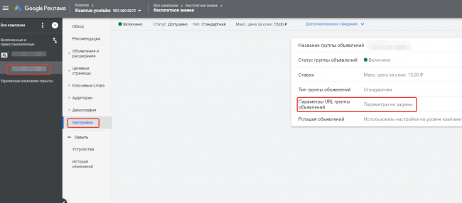 Уровень группы: Выбранная группа — Настройки — Параметры URL группы объявлений.