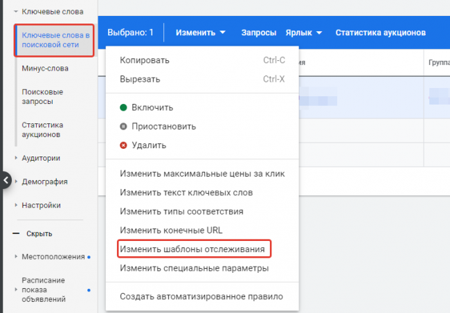 Уровень ключевой фразы: Ключевые слова — Выделяем нужные — Изменить — Изменить шаблоны отслеживания.