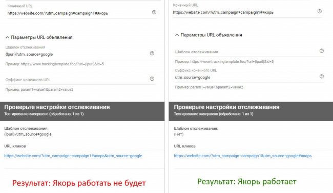 Работа с якорями. Шаблон отслеживания научился проверять наличие параметров и подстраиваться под них, но с якорями у него до сих пор возникают сложности. Согласно структуре URL, якорь должен находиться после всех параметров и начинаться через символ #. Если якорь находится до или в середине параметров, то он перестает работать.