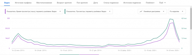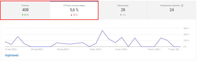 Здесь видно, что показы растут, а CTR падает — надо поработать над названием и/или миниатюрой видео