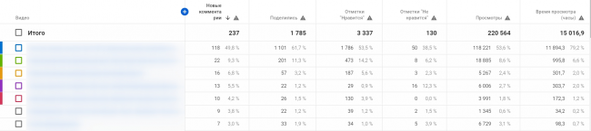 Раньше все было просто: блогеры и бизнес оценивали успех в YouTube по просмотрам и подписчикам. Теперь метрик гораздо больше, а большое количество просмотров и подписчиков совсем не гарантирует высокий доход от монетизации канала или значительный рост продаж. Разбираем 13 показателей, по которым можно отслеживать эффективность YouTube-продвижения. Важные метрики в самом YouTube Показатели просмотров: время, длительность, количество Еще в далеком 2012 году команда YouTube написала, что фокусируется на времени просмотра (watch time). Этот показатель более качественный, чем количество просмотров. Для платформы более ценно, если один пользователь смотрит ролик 10 минут, чем пять пользователей будут смотреть тот же ролик в течение одной минуте. В Творческой студии время просмотра отображается на первом экране. Достижение показателя в 4000 часов — основное условие для подключения монетизации YouTube-канала. Топовые показатели на первом экране studio.youtube.com Но это не значит, что привычное количество просмотров совсем не имеет значения. Исследование образовательного проекта для SEO-специалистов Backlinko, например, показало, что этот показатель по прежнему коррелирует с рейтингами, позициями видео в поиске. Хотя, возможно, это потому, что количество просмотров часто соответствует большему времени просмотра. Корреляцию между этими показателями можно наблюдать в расширенных отчетах раздела «Аналитика» Третий показатель, связанный с просмотрами — средняя длительность просмотра (удержание аудитории). YouTube Creator Academy советует «максимально приблизиться к стопроцентному удержанию аудитории». Однако, вероятно, что этот показатель не отдельный фактор ранжирования, а так же, как и количество просмотров, просто влияет на время просмотра (watch time). CTR CTR, или кликабельность, важен не только в контекстной или таргетированной рекламе. YouTube тоже гораздо выгоднее предлагать ролики, которые получают больше кликов и, соответственно, просмотров. В исследовательской статье о рекомендациях видеохостинга указано, что кликабельность — важный фактор ранжирования. Посмотреть CTR по каждому видео можно в Творческой студии, в разделе «Просмотры». Здесь видно, что показы растут, а CTR падает — надо поработать над названием и/или миниатюрой видео Показатель напрямую зависит от названия и значка ролика — постарайтесь сделать их привлекательнее и интереснее, если процент низкий. Согласно справке YouTube, средний показатель CTR для половины видео составляет от 2 до 10%. Вовлеченность: лайки, комментарии, шеры Лайки — не способ потешить самолюбие, а один из факторов для попадания в рекомендации и поиск, получения новых просмотров и подписчиков. Сразу два исследования — Backlinko и консалтингового агентства Briggsby — показали, что лайки, шеры, комментарии коррелируют с рейтингами роликов YouTube. В последнем, кстати, еще нашли интересную закономерность — больше всего лайков генерируют видео продолжительностью 10–16 минут. В Творческой студии нет раздела вовлеченности, гораздо проще добавить все нужные метрики в расширенный отчет. Неизвестно, какая из реакций важнее, поэтому можно просто считать их сумму. Например, так. Столбцы с комментариями, шерами, лайками и дизлайками добавляются через синий плюсик Briggsby также заметили корреляцию между рейтингом и количеством сайтов, которые встраивают видео: чем больше