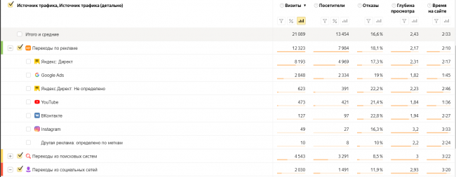 Общую статистику по переходам можно посмотреть в отчетах систем веб-аналитики по источникам трафика. Удобно сразу сравнивать его показатели по разным маркетинговым каналам.