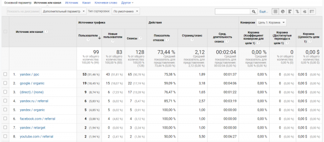 Общую статистику по достижению целей для всех каналов можно изучать в отчете «Конверсии» Яндекс.Метрики (у Google Analytics аналогично). Чтобы посмотреть конверсии только с YouTube, достаточно открыть отчет по источникам трафика и добавить новые метрики.