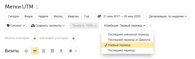 При работе с отчетами в Метрике обратите внимание на верхнюю панель, где указана атрибуция. Мы рекомендуем оценивать эффективность YouTube с моделью «Первый переход», потому что видеомаркетинг — не инструмент работы с «горячим» трафиком, как контекстная реклама. Часто платформа вносит свой вклад в начале воронки продаж, на этапе первичного контакта и знакомства с брендом и его продуктом, а сами конверсии получаются уже в дальнейшем. В Google Analytics аналогичная модель атрибуции называется «Первое взаимодействие».