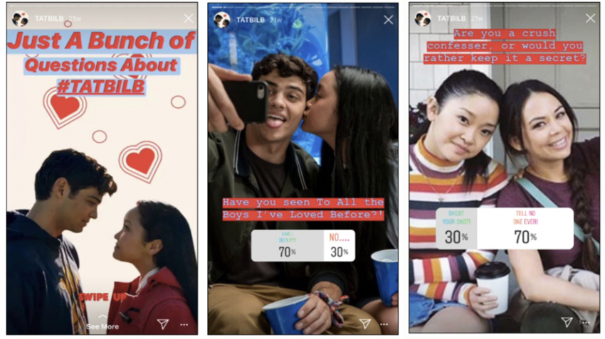 Опросы могут помочь заинтересовать аудиторию новым продуктом и направить их на сайт. В Instagram журнала Elle Magazine запустили серию опросов о романтической комедии на Netflix «Всем парням, которых я любила раньше». Она отсылала к статье об этом сериале в Elle Magazine и мотивировала перейти на сайт, чтобы прочитать статью целиком.