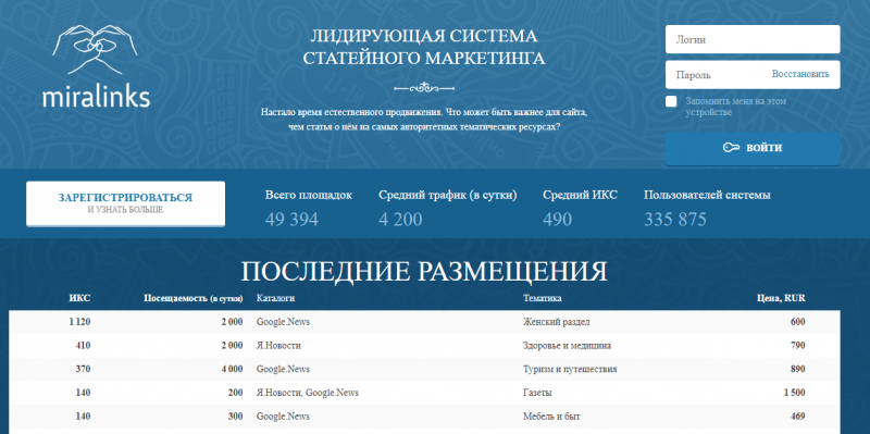 Miralinks. Самая крупная биржа, на которой можно купить вечные статьи. Подходит для разных видов ресурсов. Оплата веб-мастерам осуществляется на банковские карты, электронные кошельки.