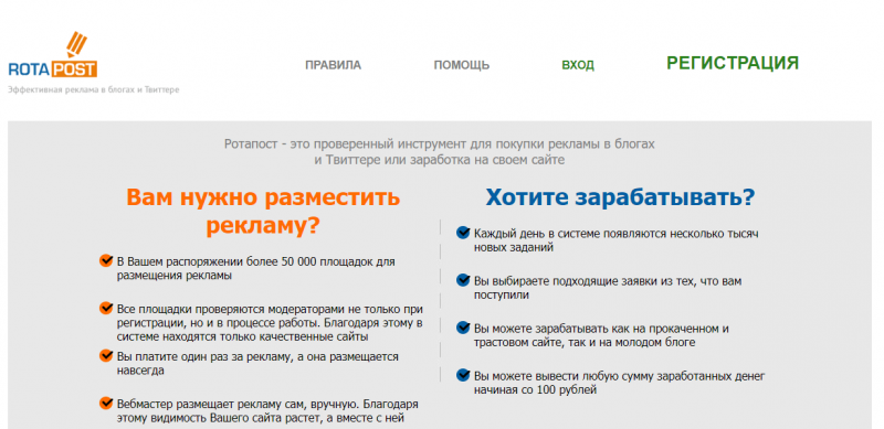 Rotapost. Известная биржа, где ведется покупка-продажа постовых ссылок. Это линки, которые встраиваются в тексты в блогах на разную тематику. Здесь можно купить постовую ссылку на ресурсах с низким ТИЦ (авторитетностью), а также на блогах, сделанных на бесплатных платформах. Выплаты – на WebMoney, сумма от 100 рублей.