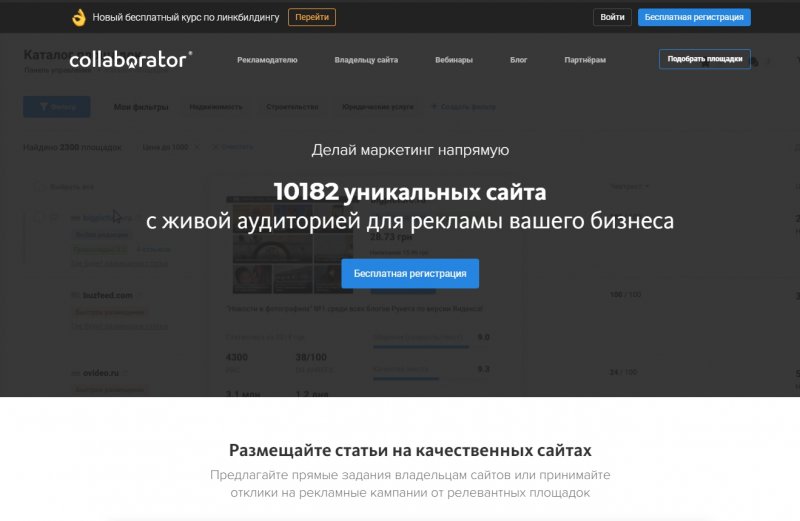 Collaborator. Биржа для продажи статей, которые можно далее разместить на качественных онлайн-ресурсах нужной тематики. Модерацию этой площадки проходят только сайты, которые имеют подтвержденный трафик (показатель оценивается по аналитическим сервисам поисковых систем). Ставит невысокую комиссию за услуги (10 %). Оптимизаторы хвалят ресурс за хорошую скорость выполнения задач, удобные способы пополнения и вывода средств с площадки.