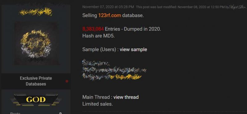 Bleeping Computer сообщает, что в минувшие выходные на хакерском форуме выставили на продажу базу данных популярного фотобанка 123rf, содержащую около 8 300 000 записей. Продавец заявляет, что дамп был сделан в 2020 году.