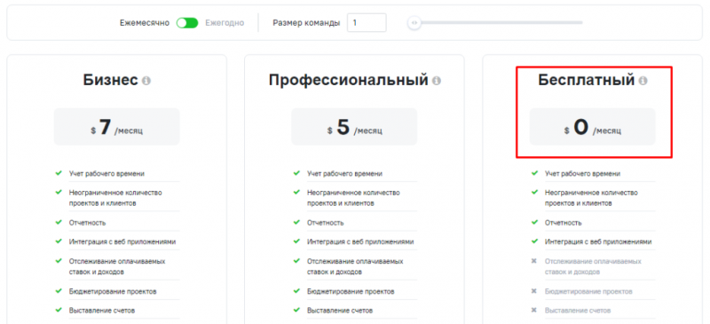 Бесплатный тестовый период — 30 дней. Сервисом можно пользоваться бесплатно (тарифный план «Бесплатный»). Максимально можно подключить до 5 человек.