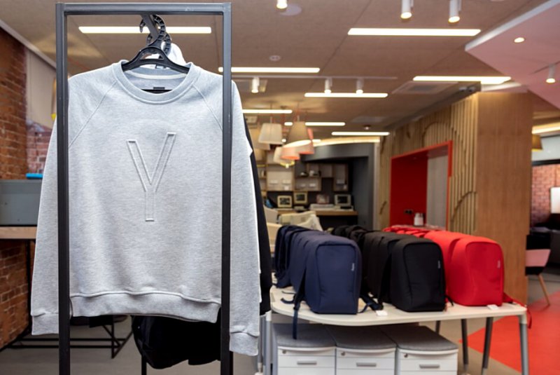 Хороший пример — стильный свитшот Яндекса с не выделяющимся но известным любому русскоязычному пользователю логотипом.