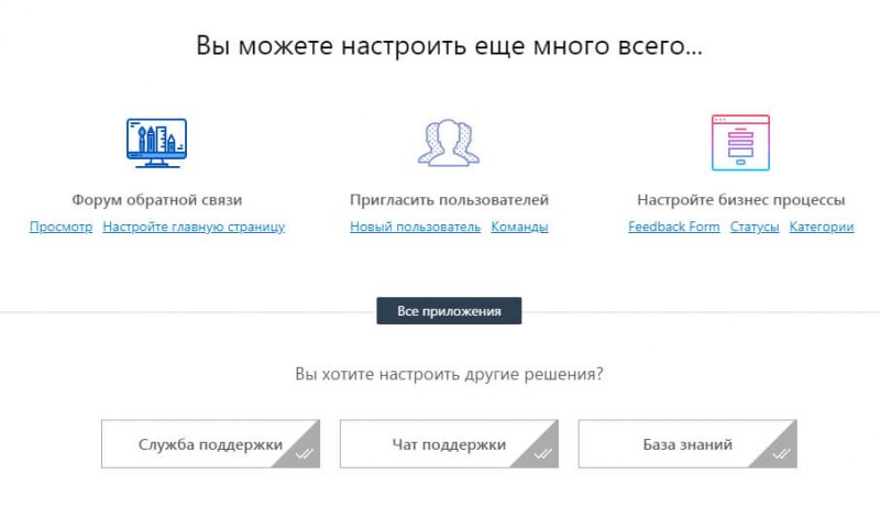 Можно настроить форму обратной связи, бизнес процессы, пригласить команду в сервис. Расширенные настройки системы находятся в разделе «Настройки/Приложения».