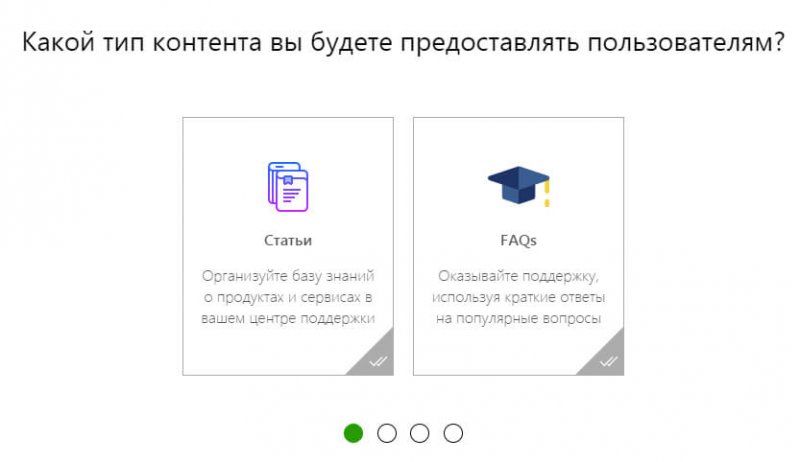 Базовая настройка. Во время настройки базы знаний можно указать, какой тип контента предоставлять пользователям — статьи или краткие ответы в разделе F.A.Q. Можно указать оба варианта.