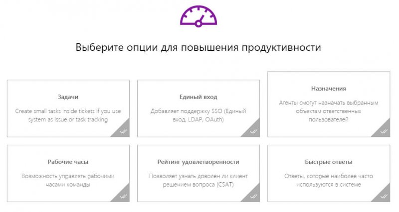 Выбираем опции для повышения продуктивности: создание задач внутри тикетов, подключение единого входа, функция назначения задач конкретным сотрудникам, управление рабочими часами команды, подключение быстрых ответов и рейтинга удовлетворенности.