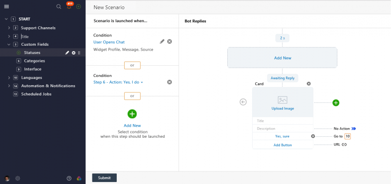 Для простой автоматизации чата, можно использовать триггеры. Если же нужно прописать более сложные сценарии, можно подключить функцию чат-бота, чтобы тот собирал необходимую информацию и перенаправлял клиентов на нужных операторов, либо выполнял другие ваши сценарии.