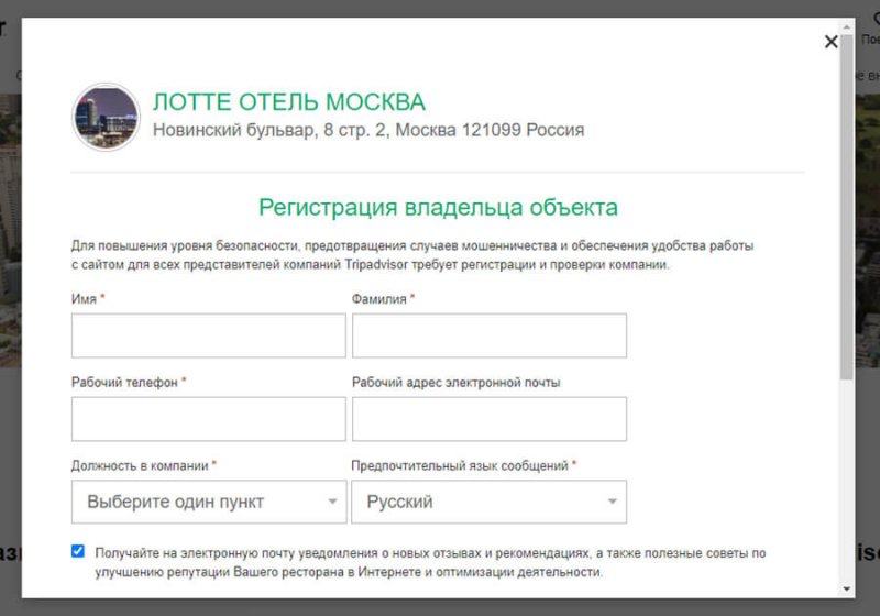 В Трипадвизор может быть только одна карточка компании. Если ваш бизнес уже фигурирует в системе (клиенты оставляли отзывы), то зарегистрировать новую карточку невозможно. Но вы сможете подтвердить владение бизнесом. Инструкцию, как это сделать читайте во втором разделе данной статьи: «Как подтвердить владение бизнесом, если компанию добавили за вас».