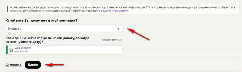 Выбираем тип заведения и подтверждаем, что являемся владельцем или представителем компании.