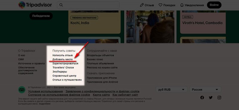 Способ #2 создать карточку объекта: спускаемся в футер сайта и жмем на «Добавить место». Дальнейшие шаги, как в первом способе.