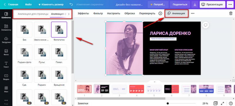 Шаг 5. Если презентация будет экспортироваться в видео, можно настроить анимацию. В некоторых шаблонах она есть по умолчанию. Для изменения эффекта кликаем на слово «Анимация» в верхней части панели и выбираем нужный. Анимацию можно настроить как для отдельного объекта (например, фото), так и для страницы в целом.