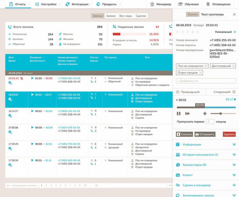 Коллтрекинг. Позволяет определять рекламные источники, с которых приходят звонки от клиентов. Доступен статический и динамический коллтрекинг, запись звонков, детальные отчеты и интеграция с другими сервисами, в частности, с CRM.