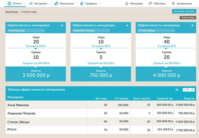 Отчеты по менеджерам. Показывают эффективность сотрудников по конкретным показателям. Можно посмотреть количество лидов, сделок, средний чек. Эту информацию можно использовать для мотивации сотрудников, например, при назначении премий. А также для выбора сотрудников, которым стоит пройти дополнительные курсы, чтобы повысить показатели.