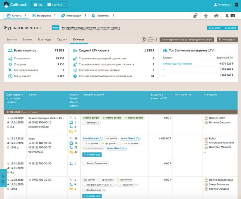 Отчеты по клиентам. Подробный журнал клиентов, где можно посмотреть их общее количество, клиентов, совершивших сделку, клиентов, которые совершили повторные сделки. Можно увидеть ТОП клиентов по выручке, средний LTV, контактные данные, источники заходов, прикрепленных менеджеров.