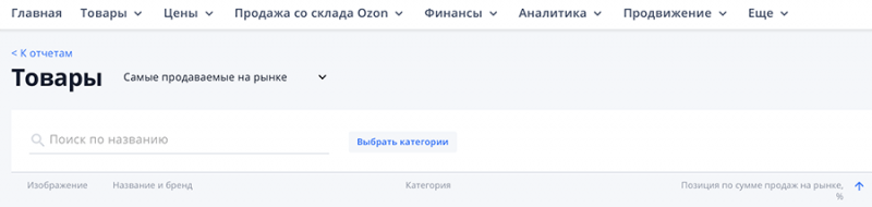 Инструмент находится на странице Аналитика → Что продавать на Ozon → Товары → Самые продаваемые на рынке.