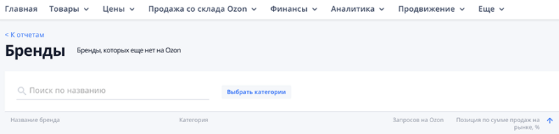 Инструмент находится на странице Аналитика → Что продавать на Ozon → Бренды → Бренды, которых нет на Ozon.