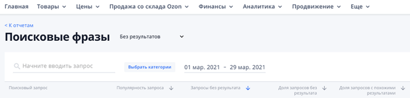 6. Без результатов. Инструмент показывает список поисковых фраз, по которым Озон не смог дать результат или предложил похожие товары. Такое бывает в двух случаях — если товар не продается на Озон, либо он не в наличии. То есть, если товар искали, но его еще никто не продает — его можете начать продавать вы. Отчет формируется за месяц, данные обновляются ежедневно. Максимальное количество запросов — 1 000. Здесь также можно смотреть не только готовый список, но и искать информацию по конкретным запросам.