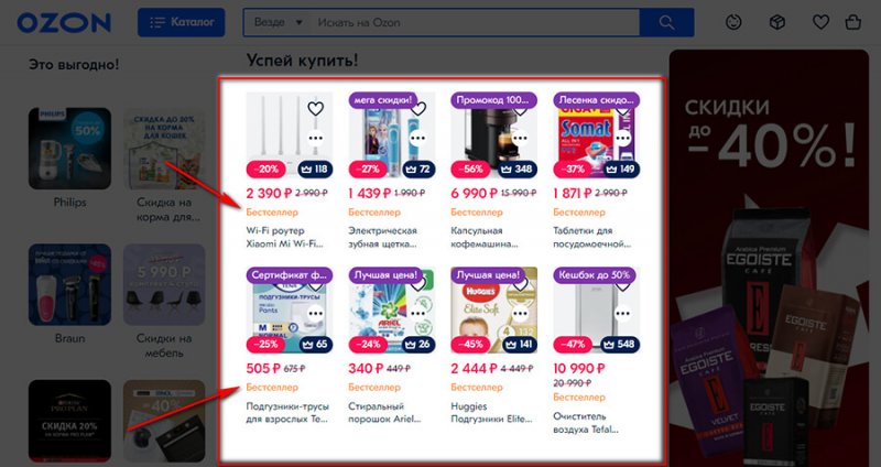 — Бестселлеры. Заходим на главную маркетплейса и ищем товары с надписью «Бестселлер». Точно также можно искать бестселлеры в конкретных категориях.