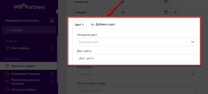 Чтобы добавить другой цвет товара, жмем на кнопку «Добавить цвет». Там также отдельно прописываем основной цвет, дополнительный, артикул цвета.