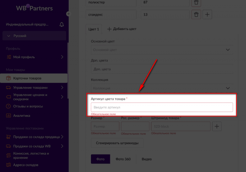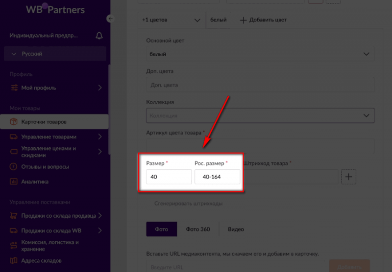 Если это не сделать, под каждый цвет и размер будет создана отдельная карточка. И, скорее всего, все эти карточки в итоге не пропустят, а укажут вам на необходимость прописать отдельные артикулы для каждого цвета и размера, но с общим артикулом поставщика, чтобы система могла их объединить.
