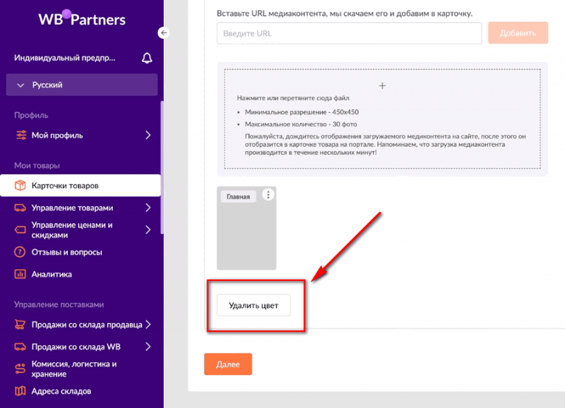 Если хотим убрать цвет (например, товар такого цвета вы продавать больше не будете), то открываем форму по этому цвету, где прописывали основной, дополнительный, артикул цвета. Прокручиваем вниз. Там будет кнопка «Удалить цвет».