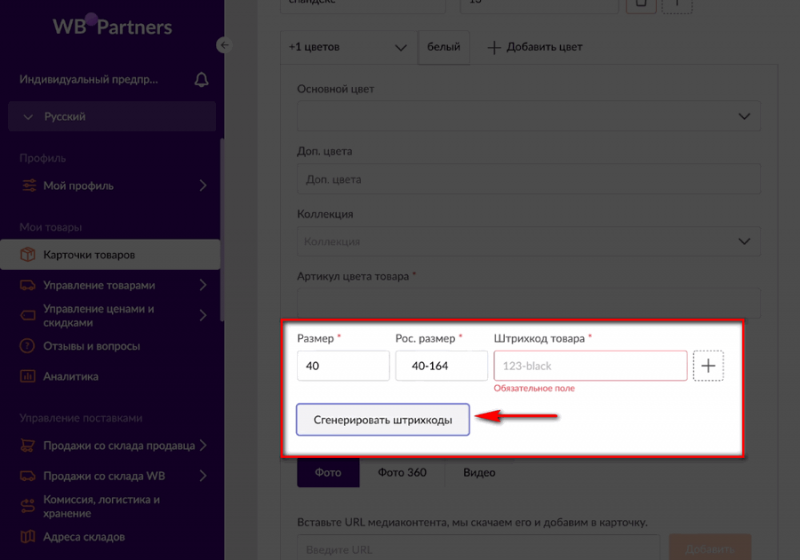 Шаг 12. Штрихкоды. После того как заполнили данные по цветам, артикул цвета и размеры, жмем на кнопку «Сгенерировать штрихкоды».