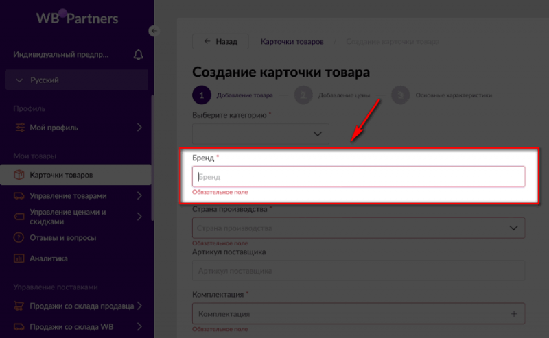 Первое, что заполняем — бренд. Здесь пишем название бренда только если у вас есть зарегистрированная товарная марка либо документы, позволяющие продавать товар чужого бренда.