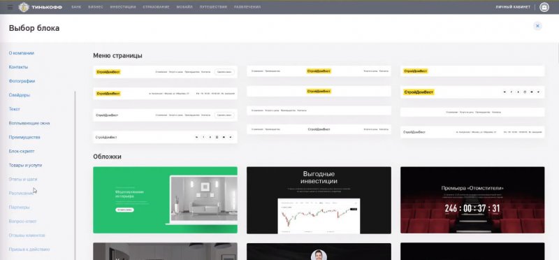 Редактор: ну очень сильно похож на Тинькофф – также выбираем готовые секции и меняем их. Секций много, возможности кастомизации широкие.