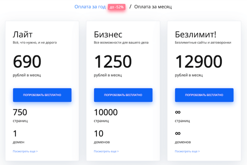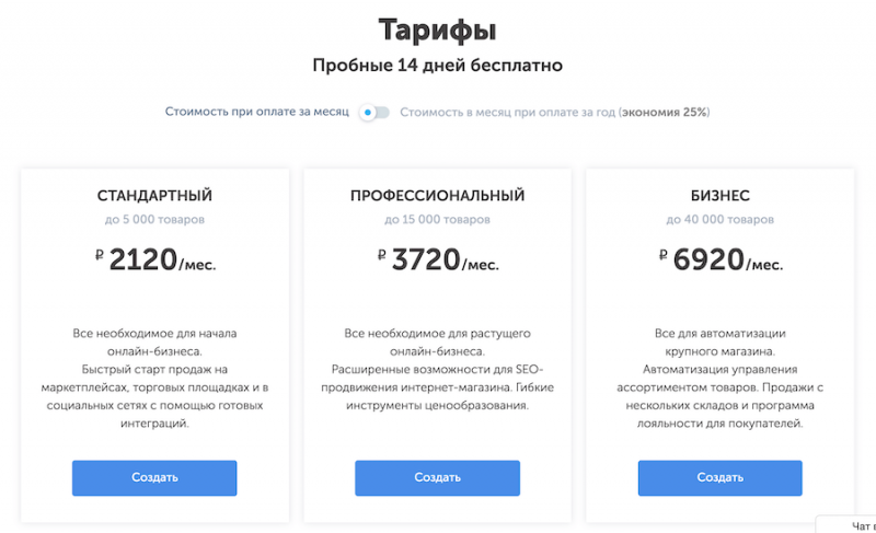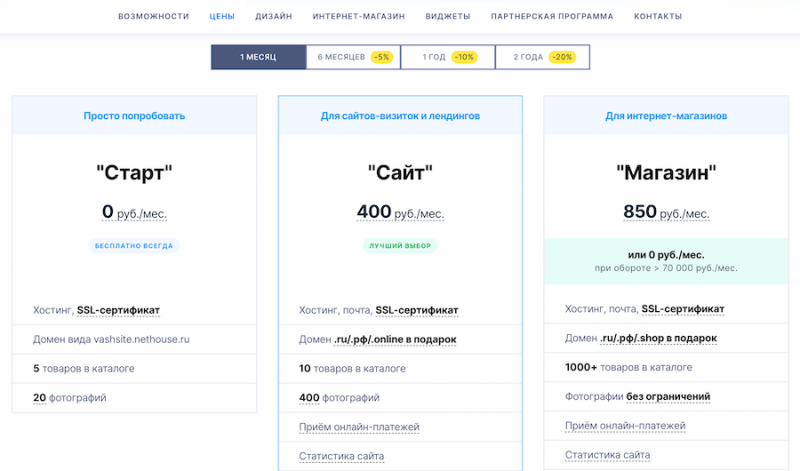 Цена: есть бесплатная версия с ограничениями или 400 рублей в месяц за обычный сайт и 850 рублей/месяц за интернет-магазин. Тарифы при ежемесячной оплате: