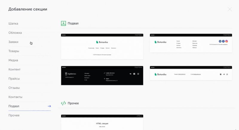 Шаблоны: есть готовые шаблоны сайтов, они разбиты по сферам бизнеса. Можно сделать сайт с нуля из готовых блоков.