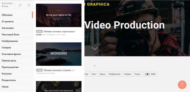 Редактор: механика создания сайта в этом конструкторе похожа на Тильду – здесь также есть готовые блоки (более 150 штук), которые нужно перетаскивать и переделывать под себя.