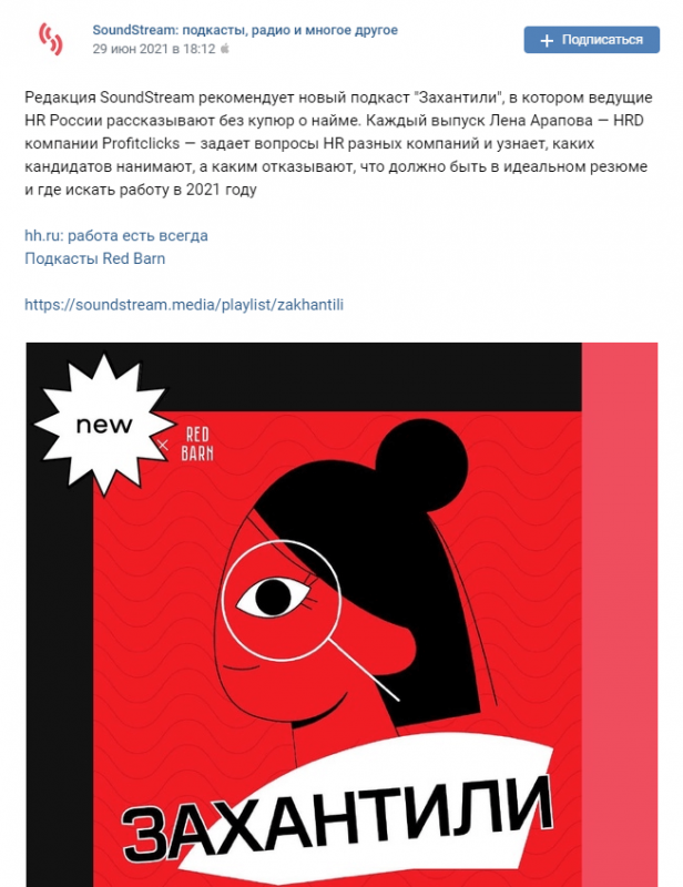 Такой подкаст у нас есть с сервисом hh.ru. «Захантили» посвящен вопросам трудоустройства в крупные компании. Чтобы запустить подкаст, мы выяснили, что будет интересно и актуально аудитории. Также обратились к HR крупных компаний, которые поделились с нами, как к ним можно попасть на работу. Далее необходимо было найти компетентного ведущего. После долгих поисков у нас получилось. В итоге подкаст занял топовые позиции в Яндекс.Музыке, Castbox и на других площадках.