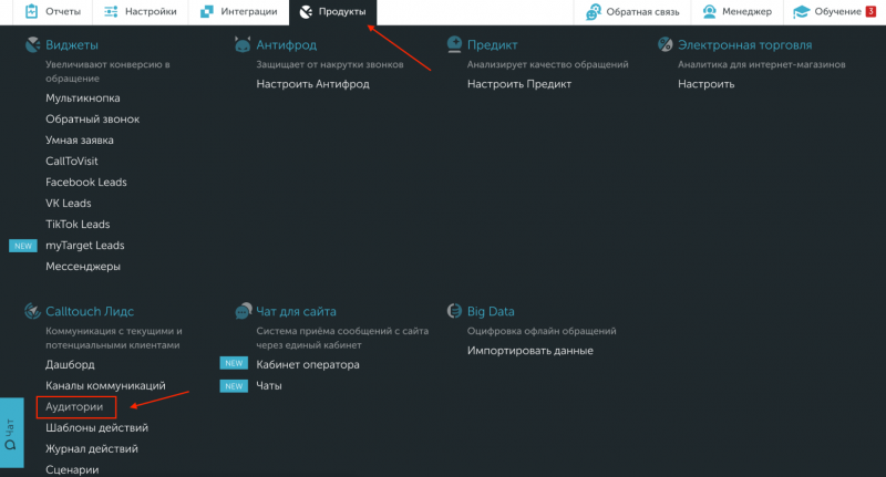 Шаг 1. Зайдите в личный кабинет Calltouch, в верхнем меню нажмите «Продукты» и далее выберите «Аудитории».